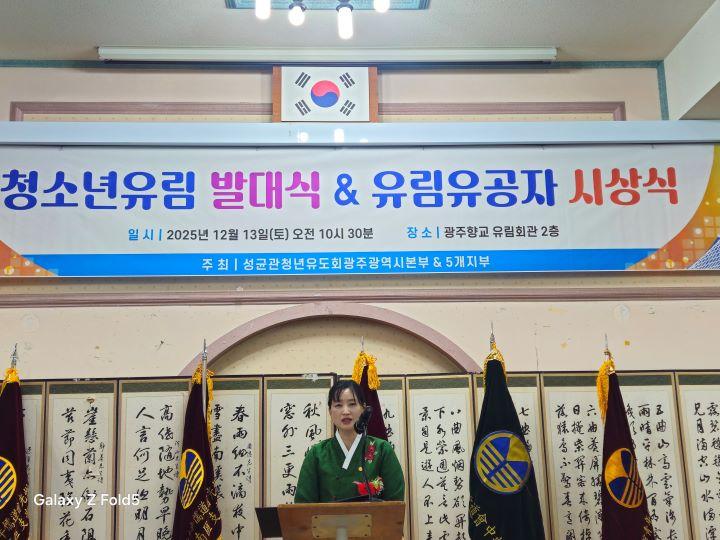 박정하 성균관청년유도회 광주광역시본부 회장은 “청소년 유림부는 인(仁)·의(義)·예(禮)·효(孝)를 생활 속에서 실천하며, 가정과 사회를 잇는 도덕적 주체로 성장해야 한다”며 “미래 세대가 바른 인성과 공동체 의식을 갖춘 인재로 성장할 수 있도록 지속적으로 지원하겠다”고 밝혔다.