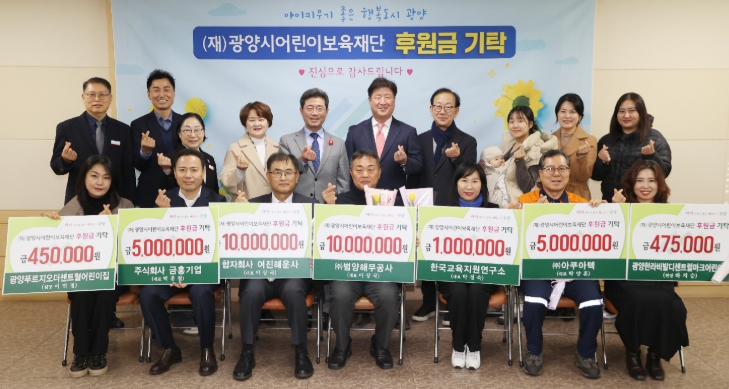 기탁 참여자는 ▲(주)범양해무공사(대표 이상국) 1,000만 원 ▲합자회사 여진해운사(대표 이상국) 1,000만 원 ▲주식회사 금홍기업(대표 박홍철) 500만 원 ▲(주)아쿠아텍(대표 박양훈) 500만 원 ▲한국교육지원연구소(대표 박정숙) 100만 원 ▲해맑은어린이집(원장 박정남) 60만 원 ▲광양한라비발디센트럴마크 어린이집(원장 하지승) 47만 5천 원 ▲광양푸르지오더센트럴 어린이집(원장 이민경) 45만 원 등이다.