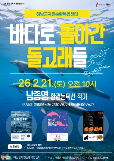 군 관계자는“이번 환경기획특별강연은 돌고래들이 바다로 돌아가기까지의 이야기를 통해 군민들이 환경을 바라보는 시야를 넓히는 계기가 될 것”이라며“강연과 플리마켓을 함께 즐기며 환경을 배우고 실천하는 뜻깊은 시간이 되길 바란다”고 밝혔다.