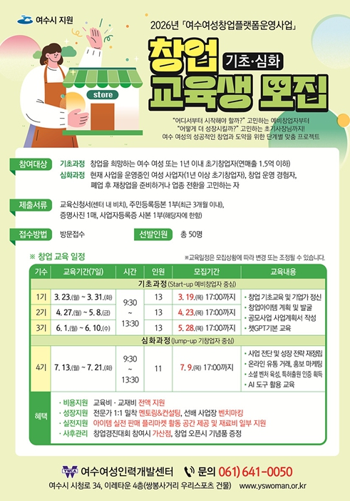 시 관계자는 “초기 창업 과정에서 다양한 어려움을 겪는 사례가 많은 만큼 기초 역량을 탄탄히 다지는 기회가 되길 바란다”며 “지역 특성에 맞는 유망 창업 아이템 발굴과 지속 가능한 창업 생태계 조성을 위해 적극 지원하겠다”고 말했다.