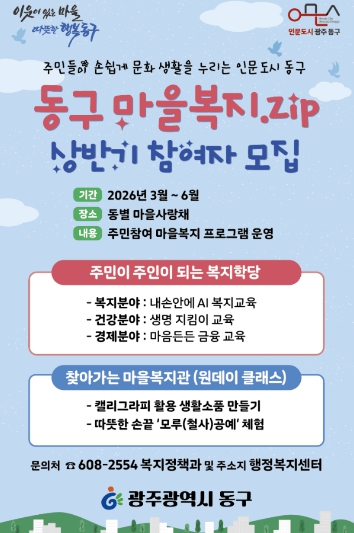 ‘마을복지.ZIP’은 주민이 생활 속에서 복지를 자연스럽게 배우고 이웃과 소통하며 정이 넘치는 마을공동체를 만들기 위한 동구 대표 마을복지사업이다. 올해는 ▲이웃 간 안부 인사 캠페인 ▲우리동네 복지 홍반장 ▲주민이 주인이 되는 복지학당 ▲찾아가는 마을복지관 등 다양한 프로그램을 운영한다.