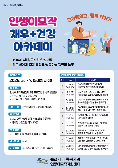 순천시 인생이모작지원센터가 운영하는 이번 프로그램은 3월 24일부터 7월 28일까지 5개월간 진행되며, 순천시에 거주하는 46세 이상 65세 미만 중·장년 40명을 대상으로 한다.