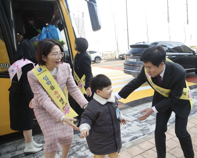 이날 김대중 교육감은 등원하는 유아 한 명 한 명을 반갑게 맞이하고 학부모와 인사를 나눴다. 교직원들과 실내·외 시설을 둘러보며 현장 의견도 청취했다.