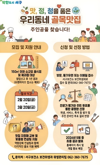 올해는 서구 관내 소규모 음식점과 제과점을 대상으로 진행되며 서류 심사와 현장 조사, 온라인 주민 투표, 전문가 심의를 거쳐 위생·맛·서비스·향토성 등을 종합 평가해 최종 16개소 내외를 선정할 계획이다.