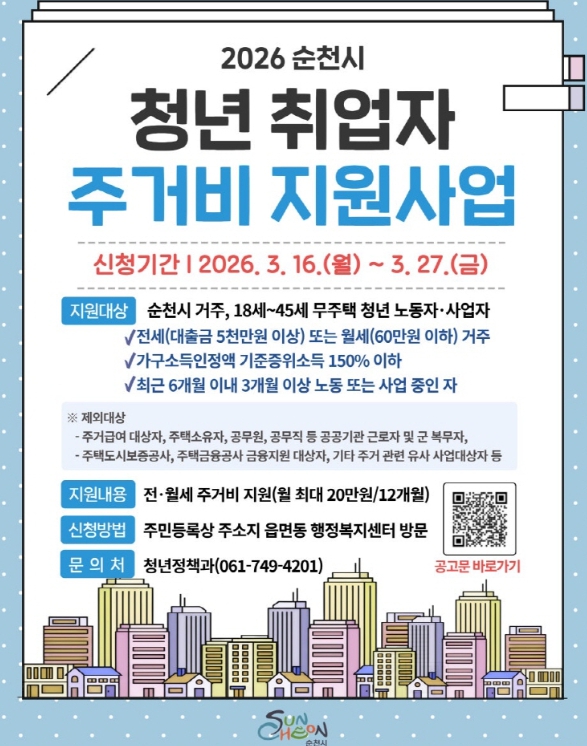 시 관계자는 “이번 월세 지원이 청년의 실질적인 생활 안정으로 이어지길 기대한다”며, “순천시는 앞으로도 청년의 삶을 가까이에서 지지하는 든든한 지원군이 되도록 노력하겠다”고 말했다.