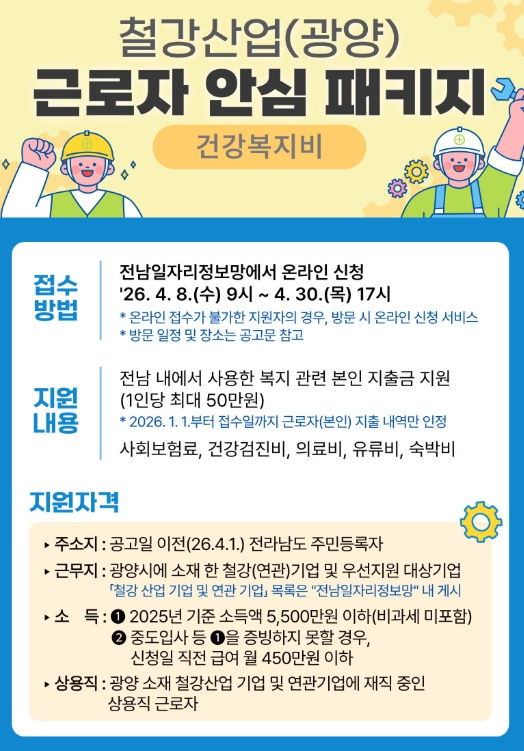 지원 대상은 공고일(2026년 4월 1일) 이전 전라남도에 주민등록을 두고 광양시 소재 철강 또는 연관 기업에 재직 중인 상용직 근로자로, 연 소득 5,500만 원 이하 또는 신청일 직전 급여 월 450만 원 이하 요건을 충족해야 한다.