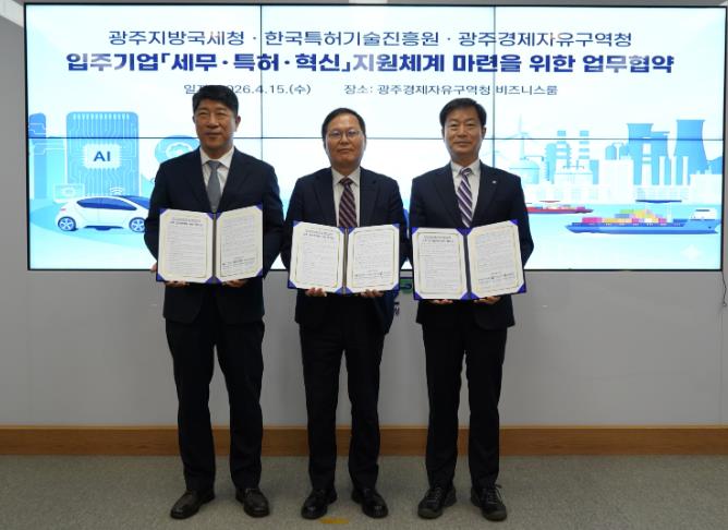 이날 협약식에는 선석기 광주경자청장, 김학선 광주지방국세청장, 김명섭 한국특허기술진흥원장이 참석해 지역 기업의 혁신 성장을 위한 협력체계 구축에 뜻을 모았다.