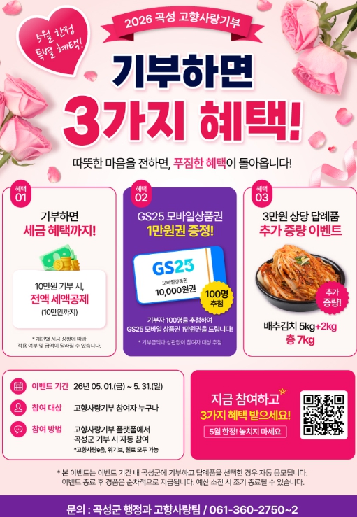 군은 이번 기부 플랫폼 확대와 함께 5월 가정의 달과 ‘제16회 곡성세계장미축제’ 성공 개최를 위한 특별 이벤트도 진행한다.