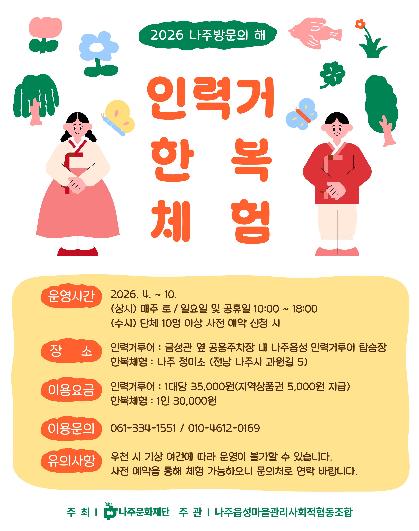 나주문화재단은 ‘2026 나주방문의 해’를 맞아 인력거투어와 한복체험 프로그램을 오는 10월까지 운영한다고 27일 밝혔다.
