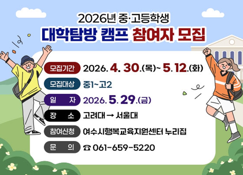 한편 여수시는 지난해 중학교 3학년과 고등학교 1학년을 대상으로 대학 탐방 프로그램을 운영했으며, 만족도 조사에서 94.2%가 ‘만족’이라고 응답하는 등 높은 호응을 얻은 바 있다.