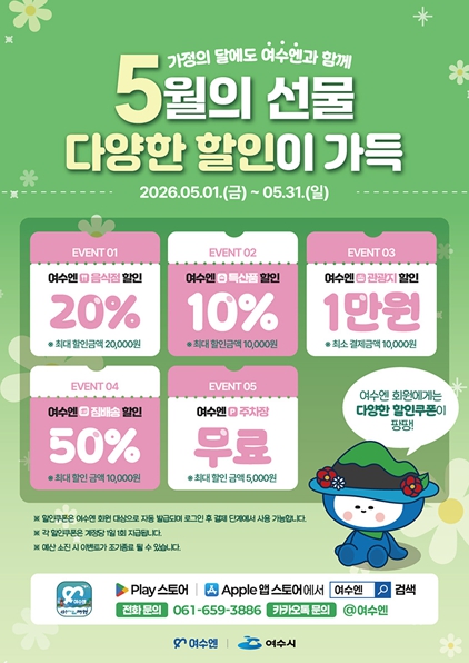 시 관계자는 “가정의 달을 맞아 관광객들이 ‘여수엔’을 통해 다양한 할인 혜택과 축제 연계 프로그램을 함께 즐기며 더욱 풍성한 여행이 되길 바란다”며 “앞으로도 체감도 높은 혜택과 즐길 거리를 지속 확대해 나가겠다”고 말했다.