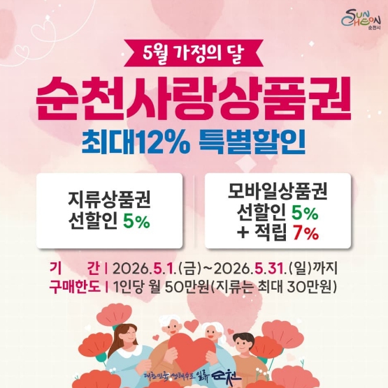 시 관계자는 “이번 순천사랑상품권 5월 할인행사는 전 시민 민생회복지원금 지급과 함께 시민들에게는 실질적인 소비 혜택을, 소상공인에게는 매출 증대의 기회를 제공하기 위해 마련했다”며 “지역에서 사용한 소비가 다시 지역 소상공인에게 힘이 되는 만큼, 순천사랑상품권 할인행사가 민생경제 회복의 마중물이 되길 기대한다”고 덧붙였다.