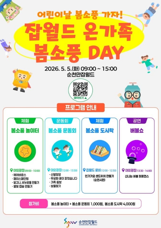 순천만잡월드 관계자는 “봄날 소풍처럼 온 가족이 함께 즐기고 어린이날의 소중한 추억을 만들 수 있도록 행사를 준비했다”며 “많은 시민들의 관심과 참여를 바란다”고 말했다.