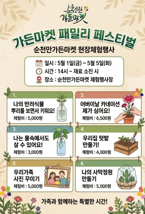 순천만가든마켓 관계자는 “5월 가정의 달을 맞아 온 가족이 부담 없이 나들이를 즐기고 수준 높은 정원 문화를 체험할 수 있도록 이번 행사를 준비했다”며, “지역 농가 소상공인과 상생하며 다채로운 문화가 숨쉬는 복합 정원 문화 공간으로서의 역할을 다하겠다”고 밝혔다.