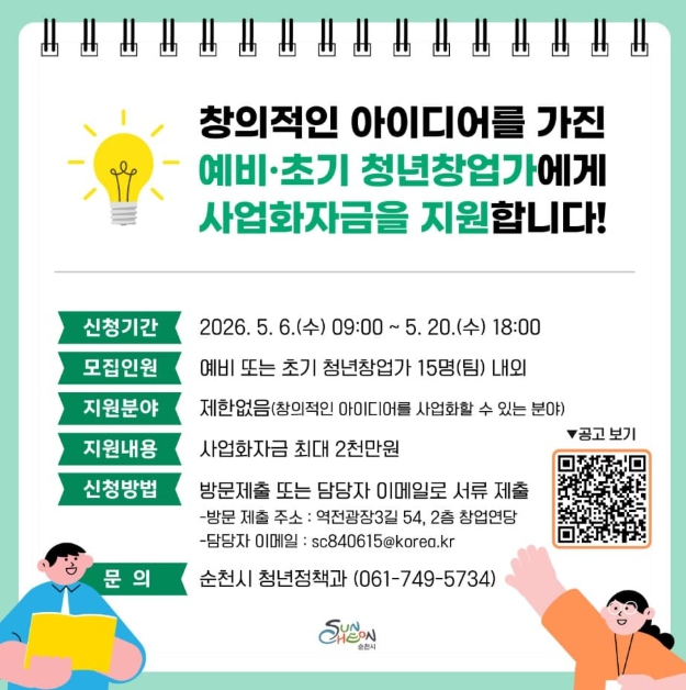 신청 대상은 만 18세부터 45세까지의 청년으로, 순천시에 주소 또는 사업장을 둔 예비창업자 또는 사업자등록 3년 이내의 초기 창업자이며, 15명(팀) 내외를 선발해 최대 2천만 원의 사업화 자금을 지원할 예정이다.
