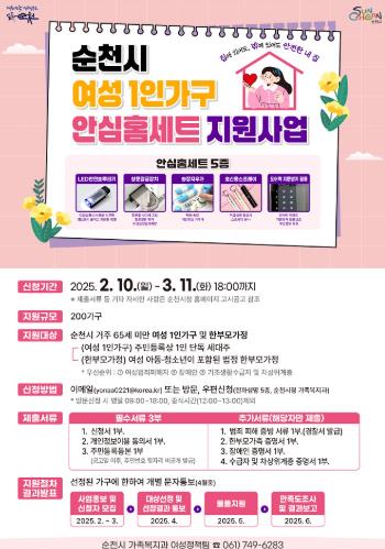 신청 자격은 순천시에 주민등록을 둔 65세미만 ▲여성 1인가구 ▲한부모가정이다. 여성범죄피해자, 장애인, 기초생활수급자, 차상위계층 등 우선순위 조건에 맞춰 선정하여 지원할 계획이다.