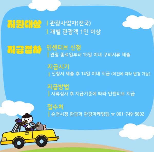 ‘순천시 관광객 유치 인센티브 지원사업’은 관광진흥법에 따라 관광사업을 수행하는 여행사 및 개별 관광객이 관내 숙박업소, 관광지 및 음식점 등을 이용할 경우 지원 기준 충족 시 인센티브를 지원하는 사업이다.