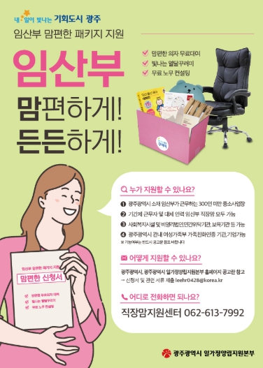 ‘맘편한 패키지’는 지역 사회적기업이 제조한 임산부 맘편한 의자, 직장생활꾸러미를 지원하고, 임산부 모·부성보호 관련 무료 노무상담을 진행한다.