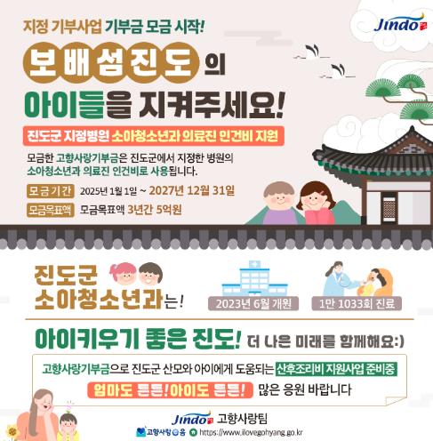 김희수 진도군수는 “진도의 미래인 아이들에 대한 의료 접근성을 개선하기 위해 진도군의 의미 있는 첫 번째 지정 기부사업에 많은 분들이 큰 관심을 가지고 적극적으로 참여 해줄 것을 부탁드린다”라고 밝혔다.