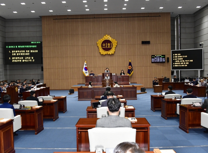 또한, '2025년도 제1차 수시분 공유재산관리계획안'등 동의안 2건, '미집행 도시계획시설 단계별 집행계획 의견청취의 건'등 2건, '광주 미래 핵심사업 추진 촉구 대정부 건의안', '광주광역시장·교육감 및 관계공무원 출석 요구의 건'을 처리했다.