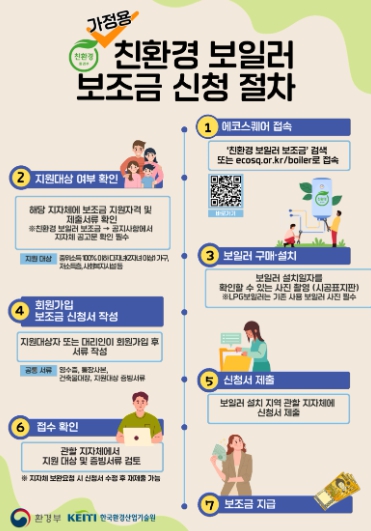 보조금이 지원되는 친환경 보일러는 한국환경산업기술원의 환경표지 인증을 받은 제품이다. 도시가스 미공급지역의 경우 목재연료‧연탄‧기름보일러를 가정용 보일러로 인증받은 LPG보일러로 교체해도 지원받을 수 있다.