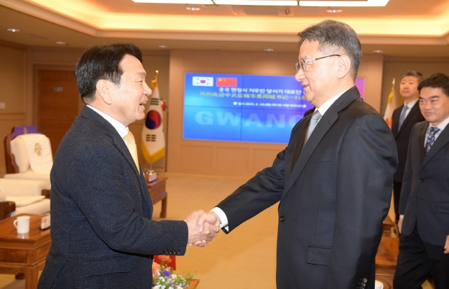 강기정 광주광역시장은 13일 시청 비즈니스룸에서 광주를 방문한 저우빈(周斌) 당서기 등 중국 옌청시 대표단을 접견하고 자동차·에너지 산업 협력방안을 논의했다.