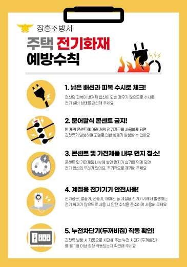 겨울철은 전열기구와 난방기기 사용이 급증해 전기화재 위험이 높아지는 시기다. 전기화재는 주로 전선 과열, 전기제품 노후화, 콘센트 과부하 등으로 발생한다. 전기화재 예방수칙은 아래와 같다.