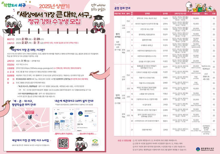 장기 과정은 ▲인문사회학과 4개 강좌 ▲문화예술학과 4개 강좌, 단기 과정은 ▲시민참여학과 5개 ▲인문사회학과 2개 강좌 ▲문화예술학과 5개 강좌 등 총 3개 학과 20개 강좌로 구성돼 있으며, 3월 10일부터 '세․큰․대 서구'평생학습관(경열로 28, 4층~5층)과 어린이생태학습도서관에서 진행된다.