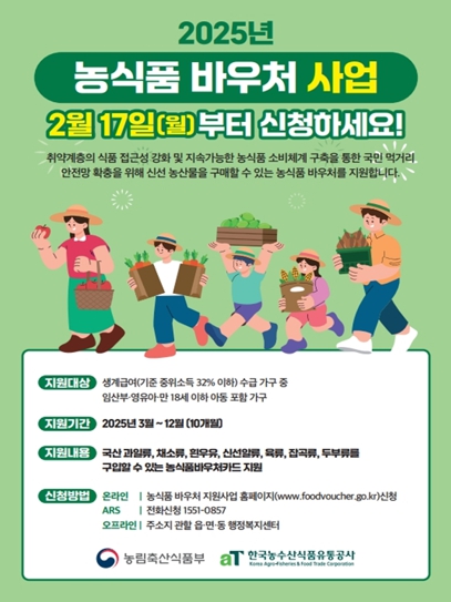 신청은 17일부터 주민등록 주소지 동 행정복지센터를 방문하거나 농식품 바우처 누리집 온라인 신청, 자동응답시스템(ARS) 전화를 통해 하면 된다. 대리신청자, 임산부 등 추가 확인이 필요한 경우 증빙서류를 지참해 방문 신청해야 한다.