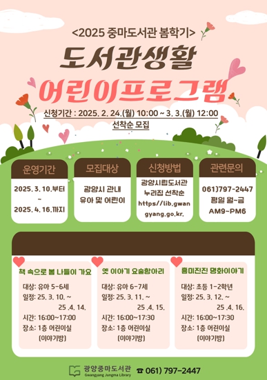 중마도서관 봄학기 도서관 생활 어린이 프로그램 수강 신청과 궁금한 사항은 광양시립도서관 누리집에 설명돼 있으며, 중마도서관에 문의해도 친절한 안내를 받을 수 있다.
