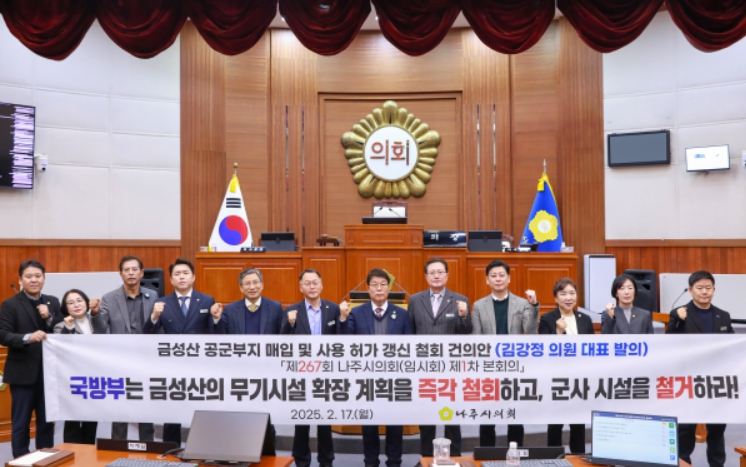 나주시의회는 이날 채택된 건의문을 대통령실, 국회의장실, 각 정당 원내대표실, 국회 국방위원장실, 국방부, 전라남도 등에 전달할 예정이다.