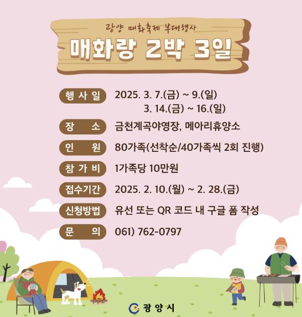 ‘매화랑 2박 3일’은 체류형 축제프로그램으로, 광양시는 광양매화축제 기간(3월 7일~9일, 14일~16일) 금천계곡 야영장과 메아리휴양소 등을 중심으로 캠핑, 축제 체험, 시티투어를 두루 엮은 프로그램을 운영한다.