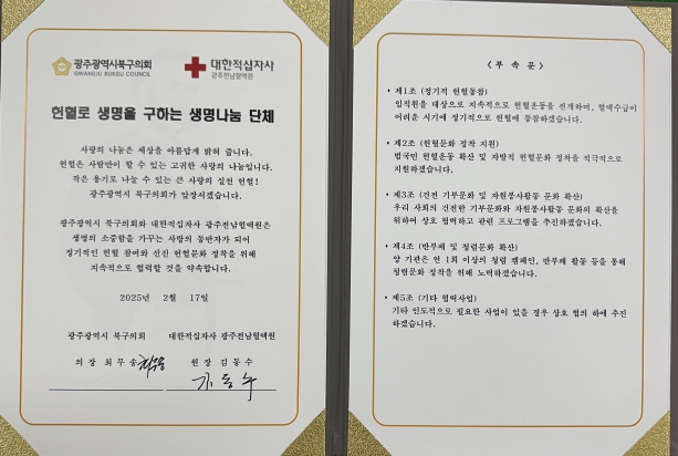 김동수 광주·전남핼액원장은 “북구의회의 적극적인 협력이 헌혈문화 정착에 큰 힘이 될 것”이라며 감사의 뜻을 전했다.