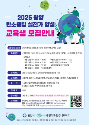 한편, 광양시와 (사)전남광양기후환경네트워크는 2,000명의 탄소중립 실천가 육성을 목표로 삼고 자체 교육 프로그램을 개발․추진해, 지난해까지 1,792명의 실천가를 배출했다. 올해 교육을 통해 50명을 추가 양성하며, 누적 수료자는 1,842명에 이를 전망이다.