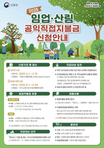 특히, 올해는 임업인의 신청 편의를 위해 임업직불금 신청 기간을 1개월 앞당기고 신청 기간은 1개월 연장해 운영한다.