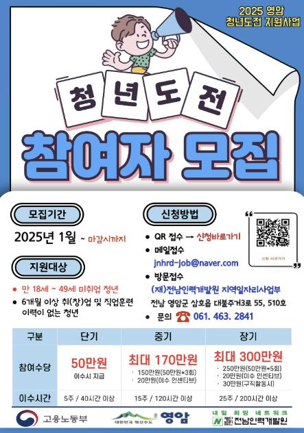 참여 희망 청년은 온라인 ‘고용24’에서 신청하면 되고, 자세한 내용은 영암군홈페이지의 고시공고문을 참조하면 된다.