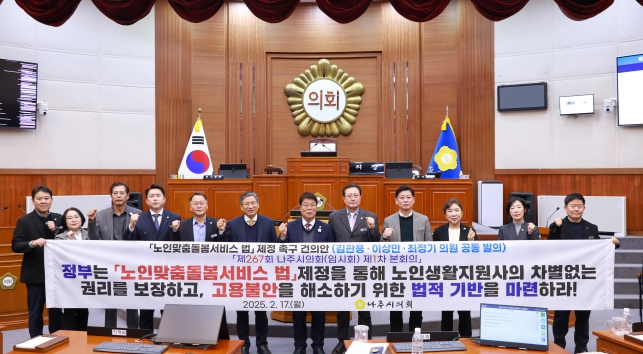 나주시의회는 이번 건의안을 통해 ▲노인맞춤돌봄서비스의 지속 가능성 확보와 서비스 질 향상을 위해 '노인맞춤돌봄서비스 법'을 제정할 것 ▲'노인맞춤돌봄서비스 법' 제정으로 노인생활지원사 권리 보장 및 고용불안 해소를 위한 법적 기반을 마련할 것을 촉구했다.