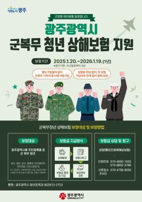 권윤숙 청년정책과장은 “군복무 청년 상해보험은 광주청년들의 안전한 군 생활을 지원하기 위한 것”이라며 “앞으로도 청년복지를 위한 다양한 청년지원정책 발굴에 힘쓰겠다”고 말했다.