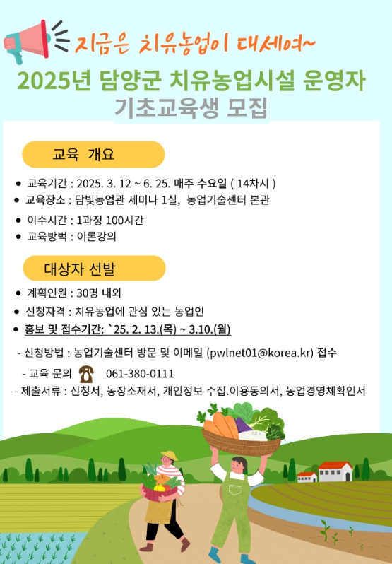 교육은 ▲치유농업의 이해 ▲치유농업 자원의 이해 ▲치유농업시설 준비 ▲치유농업 프로그램 운영 ▲치유농업시설 운영 등으로 구성해 치유농업시설 운영자에게 필요한 소양과 전문 능력을 높이고 치유농업 서비스를 표준화하는 것을 목표로 한다.