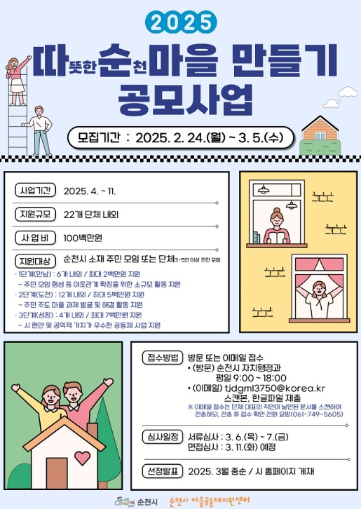 자세한 사항은 순천시 자치행정과 마을공동체팀으로 문의하면 된다.