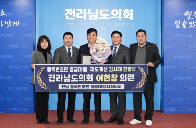 이번 감사패는 이 의원이 대표 발의한 '전라남도 자동차 등록번호판발급대행자 지정에 관한 조례 일부개정조례안'을 통해 자동차 등록번호판 발급대행자의 안정적 업무환경 조성에 기여한 공로를 높이 평가받은 결과다.