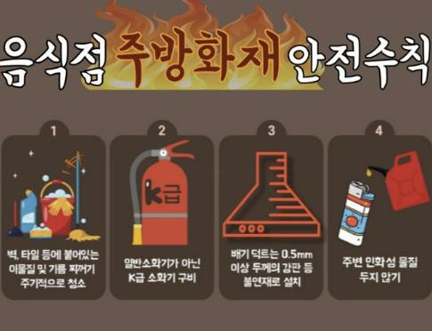 이에 여수소방서는 ▲이물질 및 기름 찌꺼기 주기적으로 청소 ▲K급 소화기 비치 ▲주변에 인화성 물질 두지 않기 ▲ 배기 덕트는 불연재료로 설치 등의 안전수칙을 홍보하고 있다.