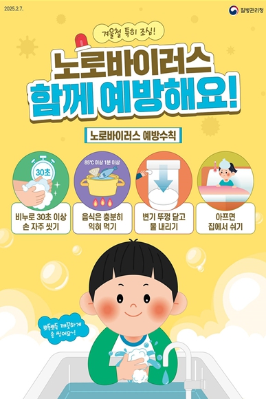 노로바이러스 감염증을 예방하려면 비누로 30초 이상 손을 씻고, 어패류는 충분히 익혀 안전하게 섭취해야 한다.