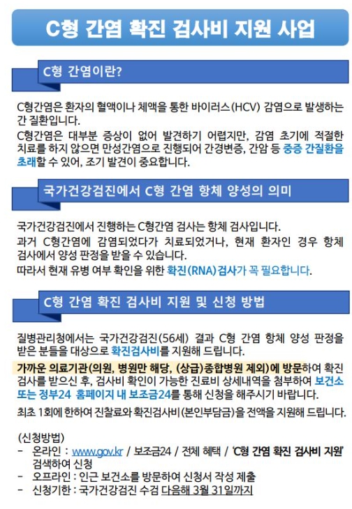 지원대상은 올해 기준 56세 국가건강검진 수검자 중 C형간염 항체 양성 결과를 받고, 가까운 병의원에서 확진검사(HCV RNA 유전자 검출 검사)를 받은 시민으로, 최초 1회에 한해 진찰료와 확진검사비 본인부담금 전액을 지원한다.