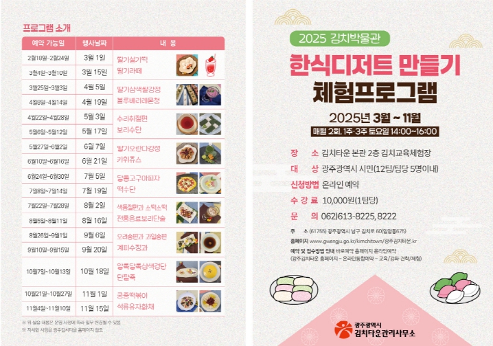 각 교육·체험 프로그램들은 온라인 사전예약제로 운영된다. 수강료와 일정 등 자세한 사항은 광주김치타운 누리집을 통해 확인할 수 있다. 광주시는 어려운 경제여건을 감안하고 시민의 부담을 줄이기 위해 대부분의 프로그램 수강료를 동결했다.