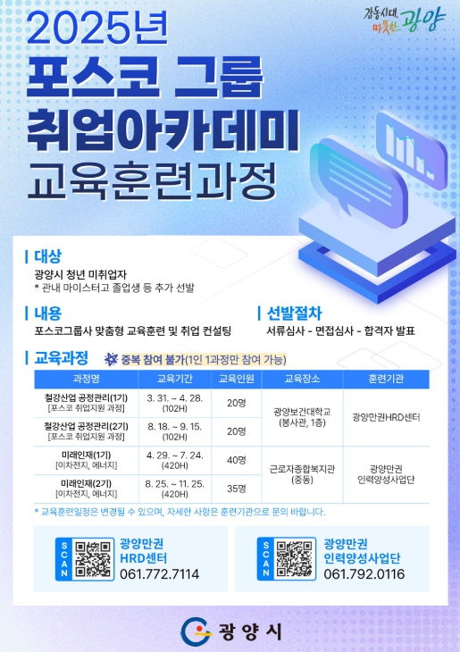 조동수 광양시 청년일자리과장은 “포스코그룹 취업아카데미는 지역의 유능한 인재가 지역 내 대기업에 취업할 수 있도록 지원하는 사업”이라며, “올해는 교육과정이 확대된 만큼 지역 청년들의 더 많은 관심과 참여를 바란다”고 말했다.