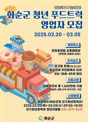 신청 자격은 공고일 기준 화순군 관내 주민등록이 되어 있는 18세 이상 49세 이하인 청년으로 푸드트럭 영업 신고와 운영을 할 수 있는 자다.