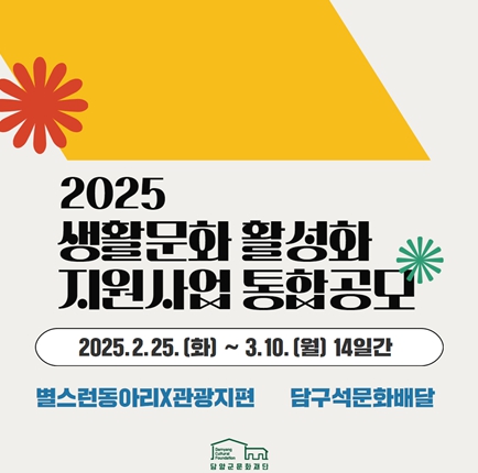 대상 사업은 ▲생활문화예술 동아리지원사업 '별스런동아리' ▲찾아가는 문화예술지원사업 '담구석문화배달' 총 2개 사업이다.