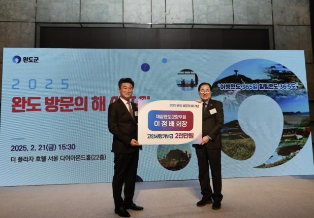 군 관계자에 따르면 재광완도군향우회 이정배 회장이 지난 21일 열린 ‘2025 완도 방문의 해’ 선포식 때 고향사랑기부금 연간 최고액인 2천만 원을 기탁했다고 전했다.