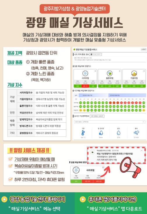 매실 기상서비스는 광양시 농업기술센터 홈페이지에서 확인할 수 있으며, 안드로이드 휴대폰의 경우 매실 기상서비스 앱을 설치하면 기상재해·방제시기 자동 알림 서비스도 받아볼 수 있다.
